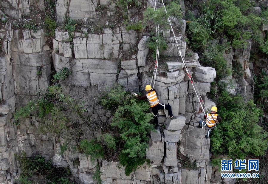 5月21日,捅山工胡军从山顶垂降,准备开始捅山作业。新华社记者郝源摄