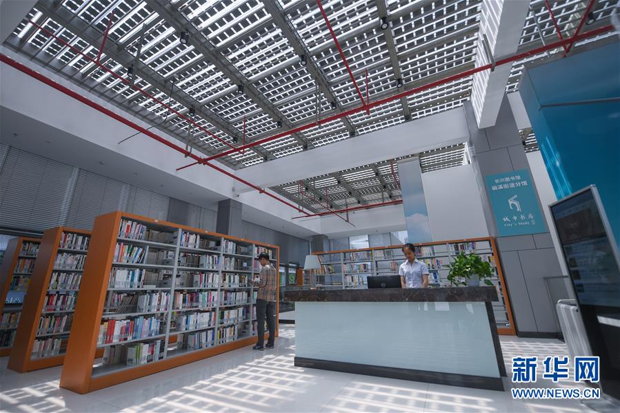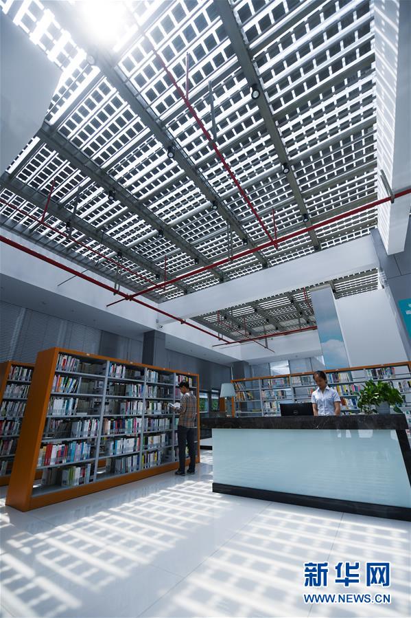 5月21日,市民在新能源小镇“城市客厅”的图书馆内看书。该图书馆顶部的光伏发电板可以随时调整角度和开合,进而控制室内采光。新华社记者徐昱摄
