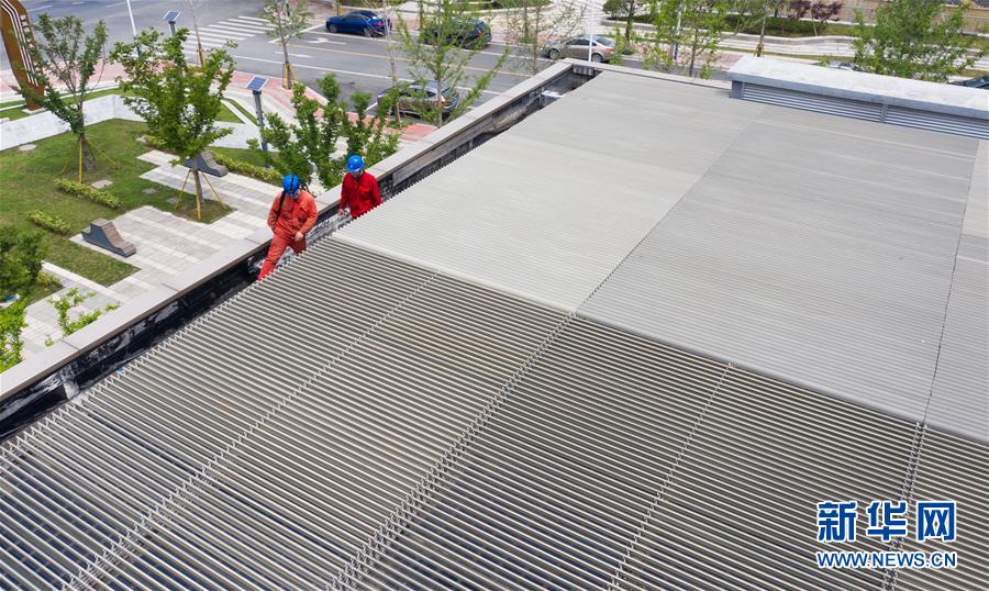 5月21日,工作人员在巡查“城市客厅”屋顶光伏设备并网情况(无人机照片)。新华社记者徐昱摄