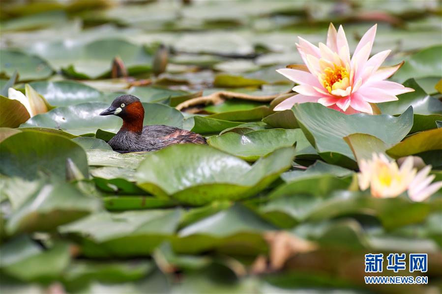 5月22日,一只在莲叶间游弋。近日,贵阳市观山湖公园内大片盛开的莲花吸引了不少水鸟在其间嬉戏觅食。新华社记者刘续摄