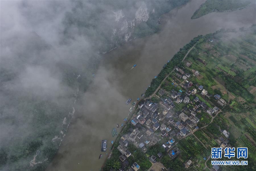 这是在广西桂林市阳朔县兴坪镇拍摄的山水风光(5月21日摄,无人机照片)。“苍苍森八桂,兹地在湘南。江作青罗带,山如碧玉篸……”一千多年前,唐朝诗人韩愈写尽桂林山水之美。初夏时节,在广西桂林市阳朔县兴坪镇,蓝天白云下,烟雨朦胧中,桂林山水尽显秀美。新华社记者 曹祎铭