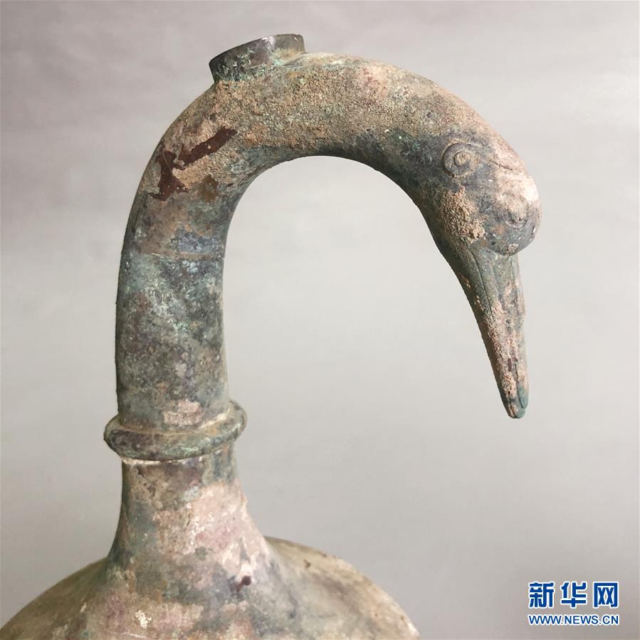 发掘出土的鹅首曲颈青铜壶(5月22日摄)。新华社记者李丽静摄