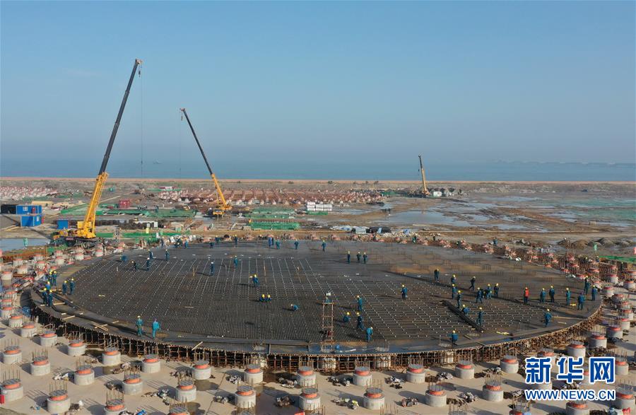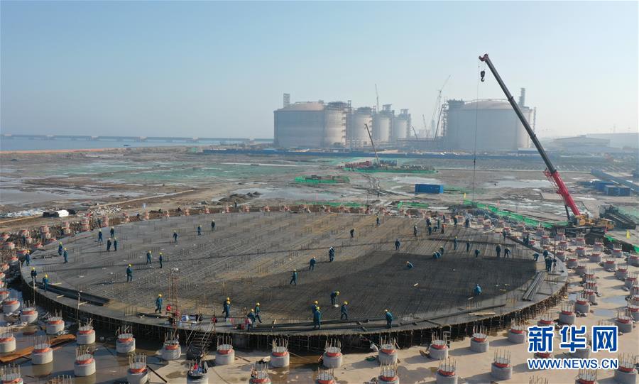 5月23日,工人在唐山市曹妃甸区LNG项目第一阶段工程储罐建设工地施工(无人机照片)。新华社记者杨世尧摄