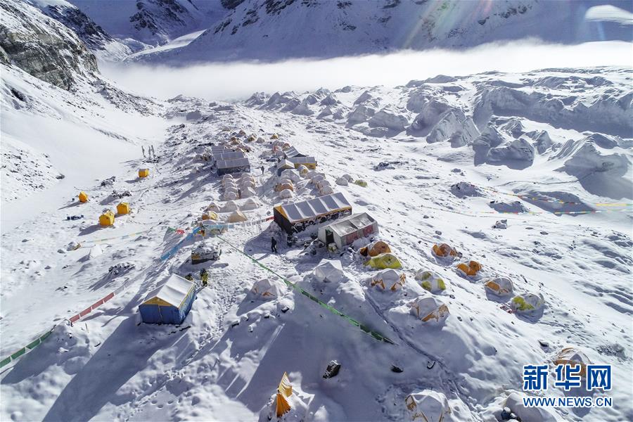 位于珠峰东绒布冰川旁海拔6500米的珠峰前进营地(5月22日摄,无人机照片)。新华社记者晋美多吉摄