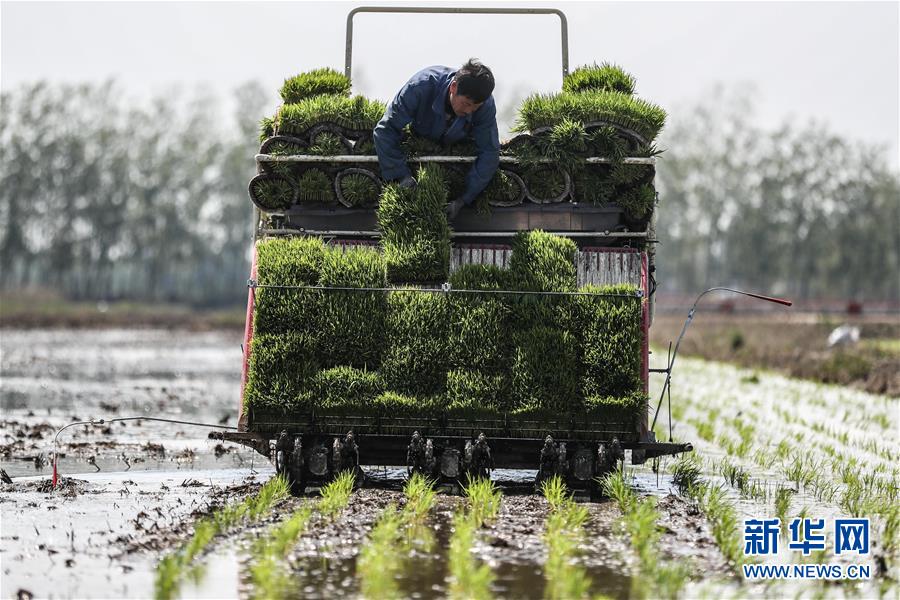5月24日,盘锦市大洼区的农民在驾驶插秧机插秧。新华社记者潘昱龙摄