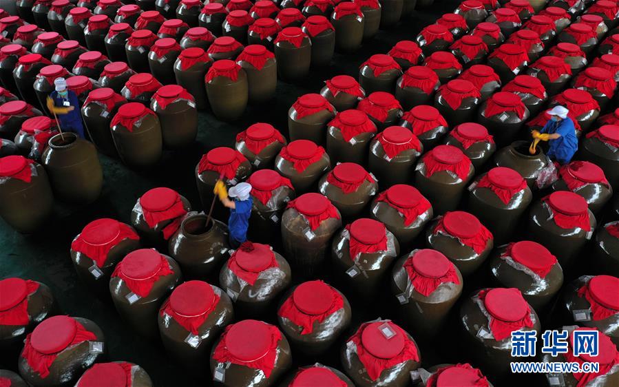 5月26日,工人在贵州省黔东南苗族侗族自治州麻江县明洋食品公司生产车间搅拌酿造过程中的酸汤原料。
