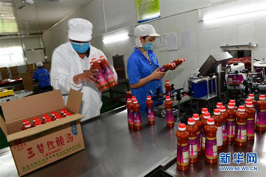 5月26日,工人在贵州省黔东南苗族侗族自治州麻江县明洋食品公司生产车间灌装古法酸汤。新华社记者杨楹摄