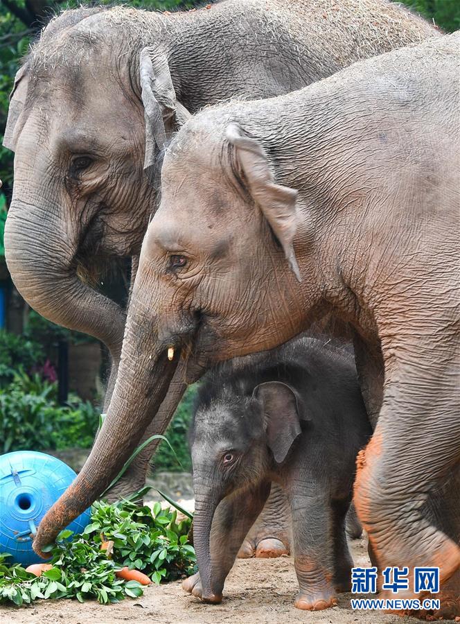 5月27日,广州长隆的新生亚洲象宝宝与妈妈寸步不离。新华社记者刘大伟摄