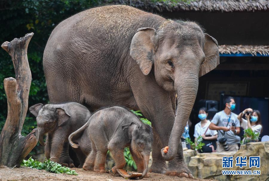 5月27日,广州长隆的两只新生亚洲象宝宝在妈妈的陪伴下玩耍。新华社记者刘大伟摄