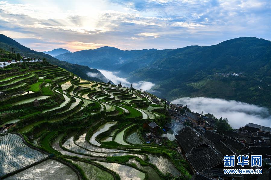 晨光中的从江县加榜乡加车梯田(5月27日摄)。夏日时节,位于贵州省黔东南苗族侗族自治州从江县加榜乡加车、加页、党扭等苗寨的梯田在晨雾与阳光的映衬下线条分明,光影变幻,景色如画。新华社记者 杨文斌 摄