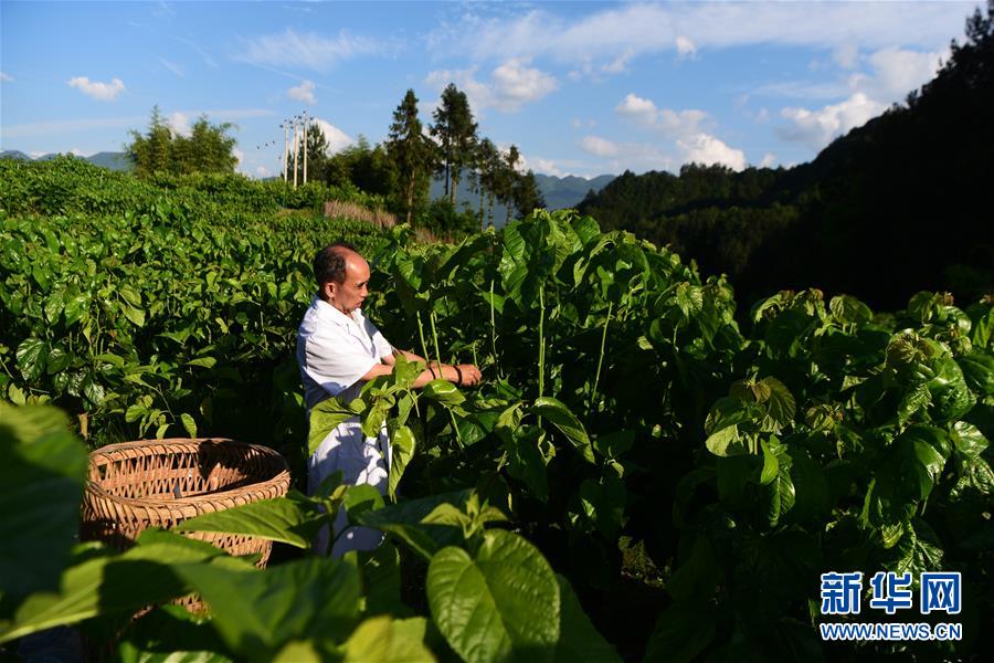 5月29日,奉节县新民镇中岭村蚕桑产业扶贫基地工作人员在采摘桑叶。