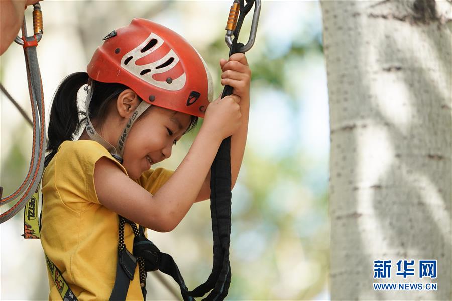 5月31日,小朋友在北京朝阳公园体验户外运动。