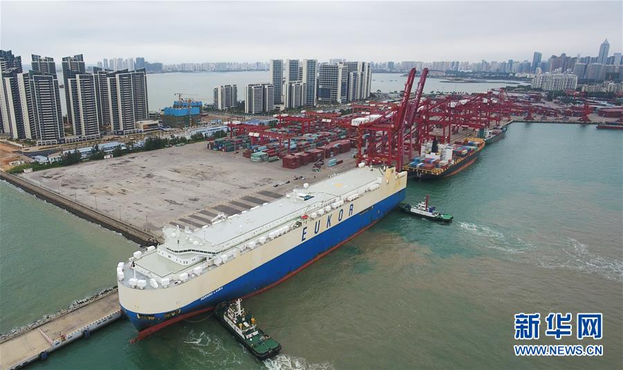滚装货船“劳拉”轮驶入海口秀英港,这是海南自贸区政策实施以来的首艘汽车外贸船(2月16日摄,无人机照片)。新华社记者杨冠宇摄