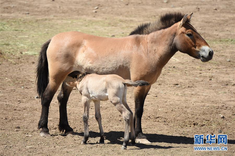 6月2日,在新疆野马繁殖研究中心,还没满月的小马驹在吃奶。