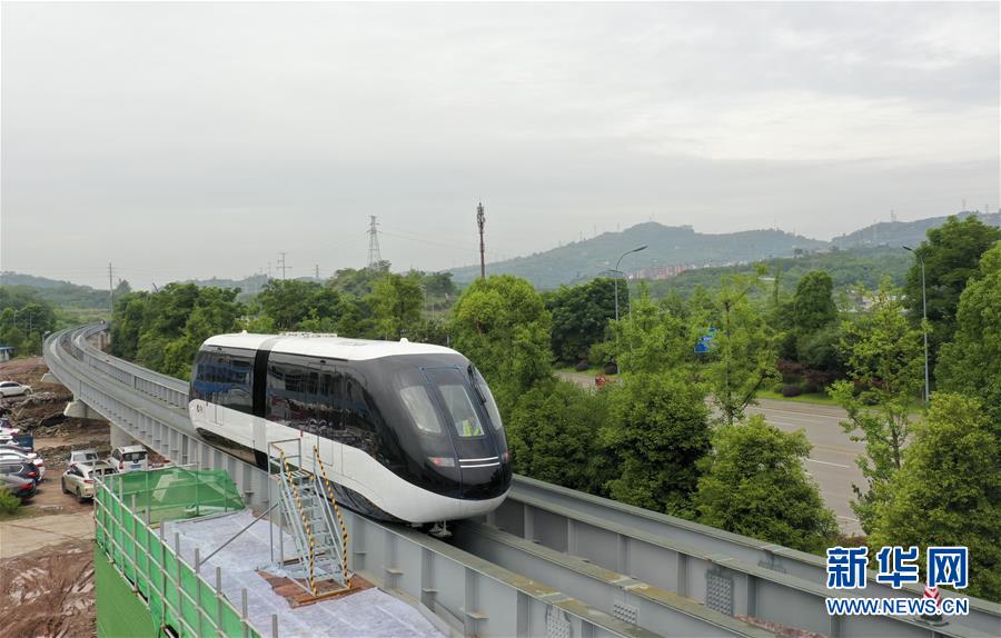 6月3日,一台“云巴”在专用运行轨道上进行调试(无人机照片)。近日,重庆市首条“云巴”示范线项目在重庆璧山区正式亮相。此次发布的“云巴”采用电能驱动,具有转弯半径小、爬坡能力强、噪音低、安全性高、建设成本低、建造周期短等优势,能为乘客提供更智能、舒适、便捷的出行体验。据介绍,璧山区“云巴”示范线项目自2019年8月开建,线路正线全长15.4km,共设车站15座,预计2020年9月全线通车。新华社记者刘潺摄。