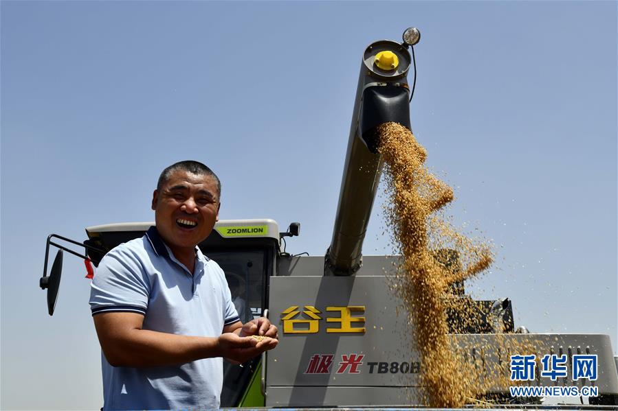 6月3日,在汶上县郭仓镇,种粮大户郭波波在收获小麦。目前,我国第二大小麦主产区山东6000多万亩小麦进入收获阶段。农民们抢抓有利天气,自南向北陆续开镰。新华社记者郭绪雷摄。
