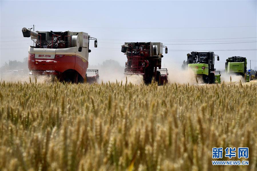 6月3日,收割机在汶上县郭仓镇的麦田里收获小麦。目前,我国第二大小麦主产区山东6000多万亩小麦进入收获阶段。农民们抢抓有利天气,自南向北陆续开镰。新华社记者郭绪雷摄。