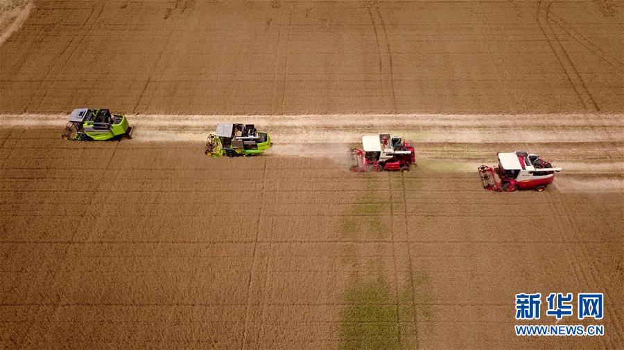 6月3日,在汶上县郭仓镇,收割机在收获小麦(无人机航拍)。目前,我国第二大小麦主产区山东6000多万亩小麦进入收获阶段。农民们抢抓有利天气,自南向北陆续开镰。新华社记者郭绪雷摄。