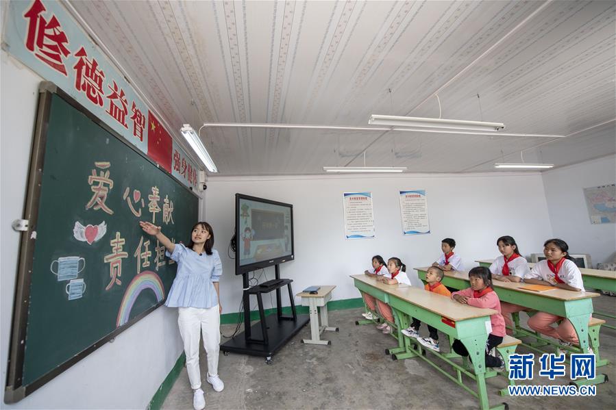 6月2日,马武寨寄小学的英语老师陈燕子为学生们上开学第一课。新华社记者杨晨光摄。