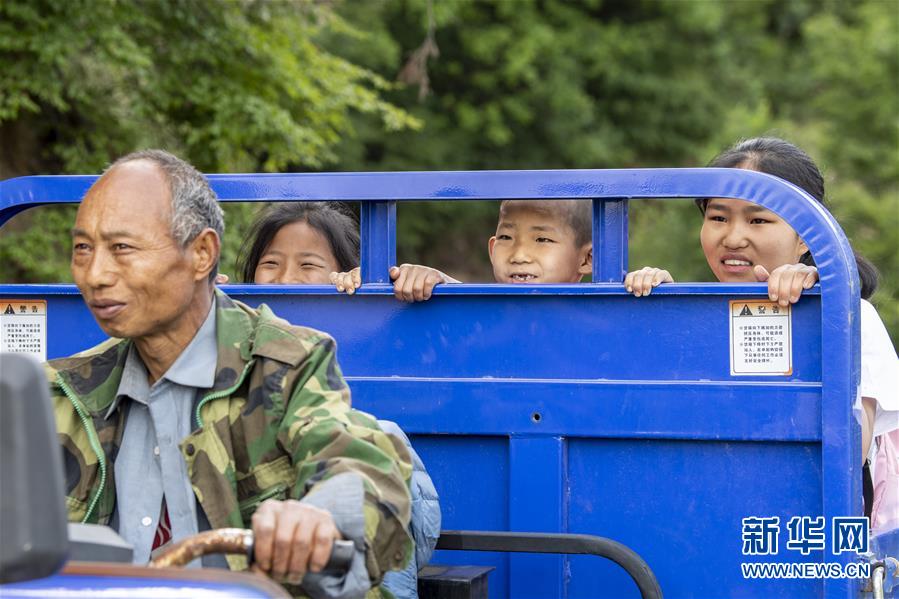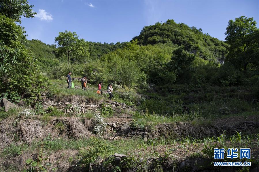 在南背村,秦春兰(右二)、秦秋兰(右三)和秦兴旺(左三)和老师们走在回家的山路上(5月31日摄)。新华社记者杨晨光摄。