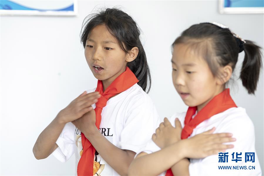 6月2日,在开学第一课上,秦秋兰(左)在做练习手语操。新华社记者杨晨光摄。