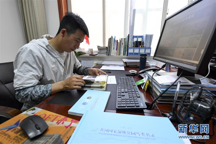 6月3日,李学明在学习鸟类知识。新华社记者冯开华摄。