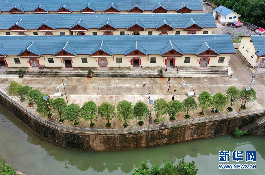 6月3日,人们在永州市新田县两江口村易地搬迁集中安置点打篮球(无人机照片)。新华社记者赵众志摄。