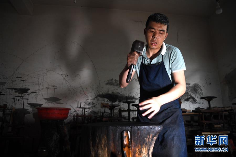 5月21日,安徽歙县“项氏徽墨”的工人在捶打墨胚。新华社记者张端摄。