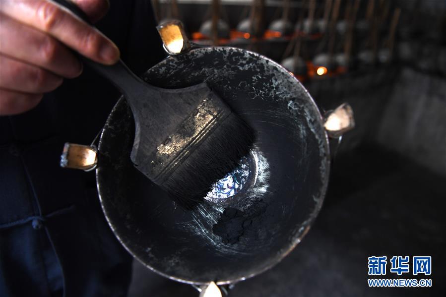 5月21日,安徽省非物质文化遗产徽墨代表性传承人项德胜收集集烟碗中的桐油烟灰。新华社记者张端摄。