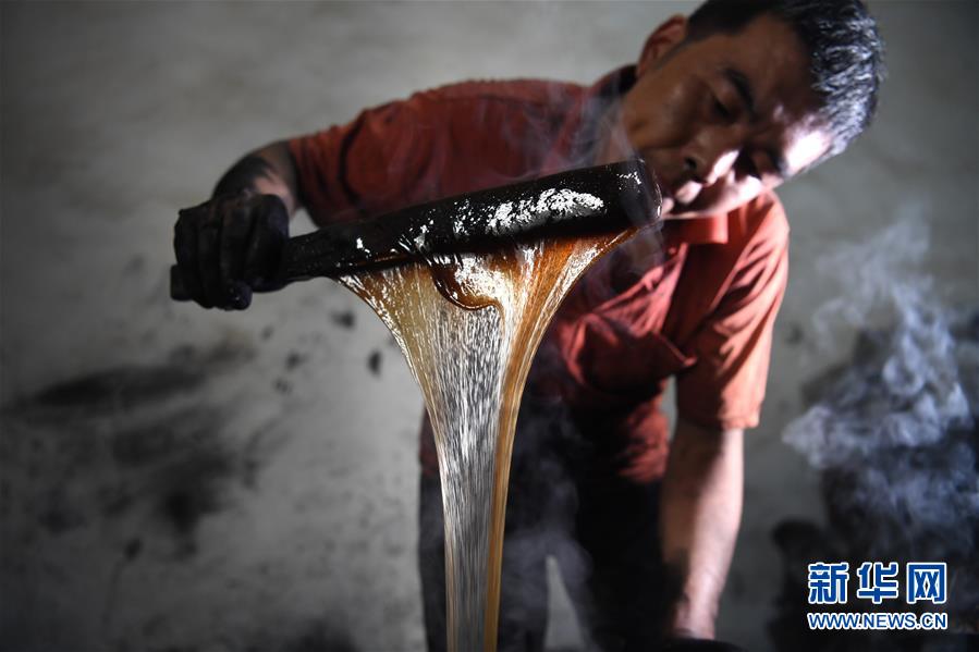 5月20日,安徽歙县“项氏徽墨”的工人在熬胶。熬好的骨胶和烟灰混合后制作成墨泥。新华社记者刘军喜摄。