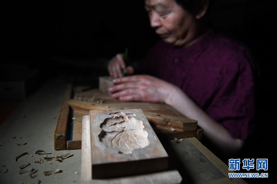 5月20日,安徽省非物质文化遗产徽墨代表性传承人项德胜在雕刻墨模。新华社记者刘军喜摄。