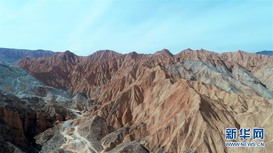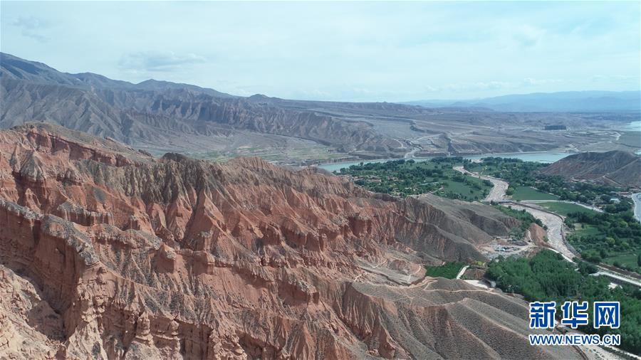 这是6月5日拍摄的位于青海省海南藏族自治州贵德县境内的丹霞地貌(无人机照片)。在青海省海南藏族自治州贵德县境内,色彩斑斓的丹霞地貌美如画卷。新华社记者赵玉和摄。
