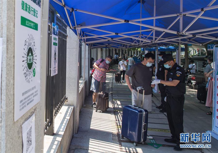 6月8日,在武汉大学西门,返校学生扫健康码进入校园。6月8日起,武汉大学、华中科技大学、武汉理工大学、华中师范大学等多所武汉高校迎来首批返校毕业生。新华社记者肖艺九摄
