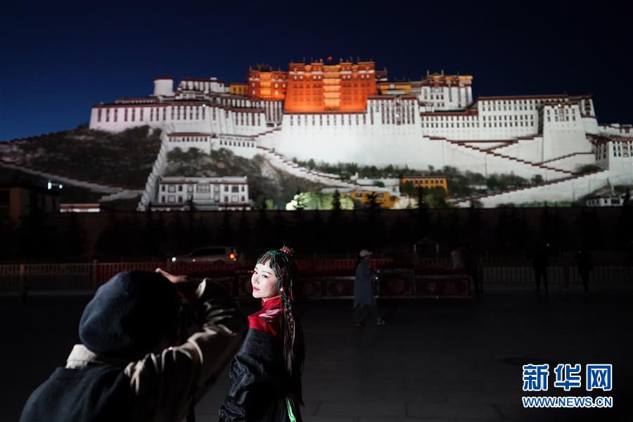 游客在布达拉宫广场拍照(6月8日摄)。夜幕降临,西藏拉萨布达拉宫灯光璀璨,夜景迷人。新华社记者詹彦摄