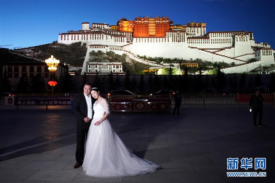 人们在布达拉宫广场拍照(6月8日摄)。夜幕降临,西藏拉萨布达拉宫灯光璀璨,夜景迷人。新华社记者詹彦摄