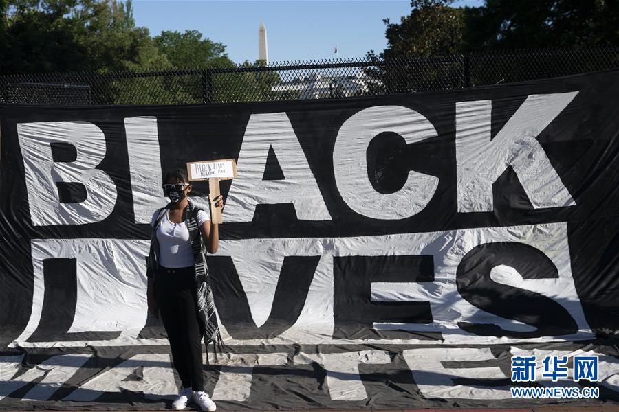 6月8日,美国华盛顿白宫附近的隔离围栏上贴着“黑人的命也是命”的抗议标语。