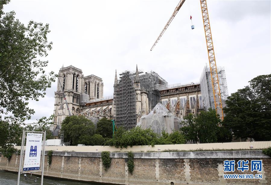 这是6月9日在法国巴黎拍摄的正在进行脚手架拆除工作的巴黎圣母院。法国巴黎圣母院于8日开始拆除去年大火中被焚的脚手架。作为巴黎圣母院修复工作的重要组成部分,这项工程预计将持续至少3个月。2019年4月15日,巴黎圣母院遭遇大火,当时圣母院正在进行维修,搭建的脚手架在火灾中损毁、变形。新华社记者高静摄