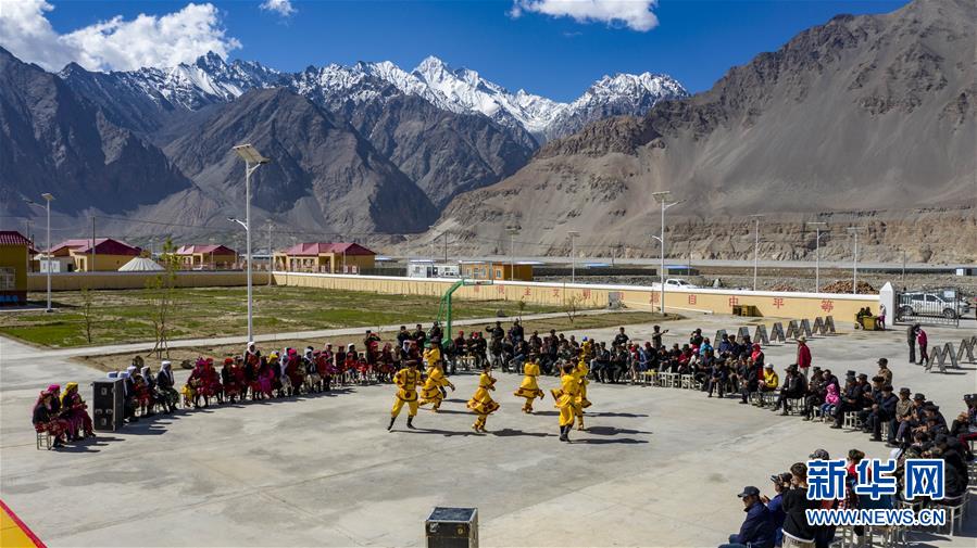 新疆塔什库尔干塔吉克自治县文工团演员在热斯喀木村为村民演出(6月6日摄,无人机照片)。