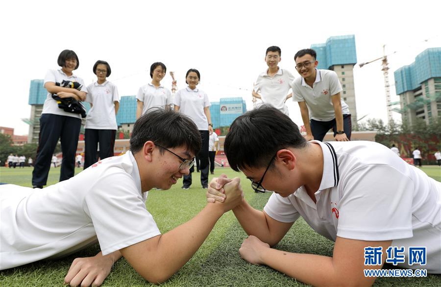 6月9日,河北省衡水市第二中学的高三学生在操场进行掰手腕比赛。2020年高考临近,河北省衡水市第二中学组织开展多种形式的集体“减压”活动,帮助高三学生在紧张备考之余释放身心压力,以轻松、乐观、自信的心态迎接高考。新华社记者朱旭东摄