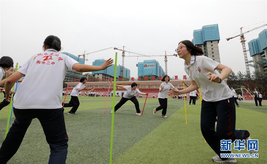 6月9日,河北省衡水市第二中学的高三学生在操场上参加减压趣味游戏。2020年高考临近,河北省衡水市第二中学组织开展多种形式的集体“减压”活动,帮助高三学生在紧张备考之余释放身心压力,以轻松、乐观、自信的心态迎接高考。新华社记者朱旭东摄
