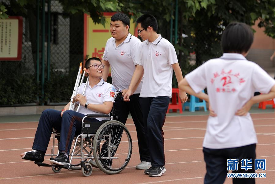 6月9日,河北省衡水市第二中学的高三学生推着一名脚部受伤的同学在操场上聊天散步。2020年高考临近,河北省衡水市第二中学组织开展多种形式的集体“减压”活动,帮助高三学生在紧张备考之余释放身心压力,以轻松、乐观、自信的心态迎接高考。新华社记者朱旭东摄