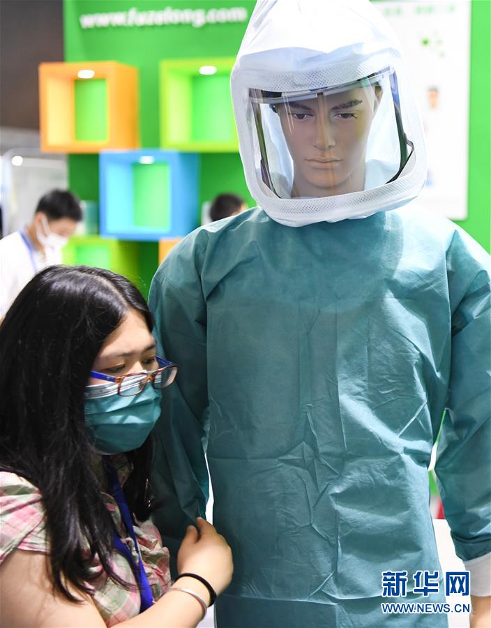 6月10日,参展工作人员在整理防护服产品。当日,广州国际防疫物资展览会在保利世贸博览馆举行。本次展会面积共计3.6万平方米,设有防疫产品、设备、综合服务、原辅料等4个展区,参展企业约600家。新华社记者邓华摄
