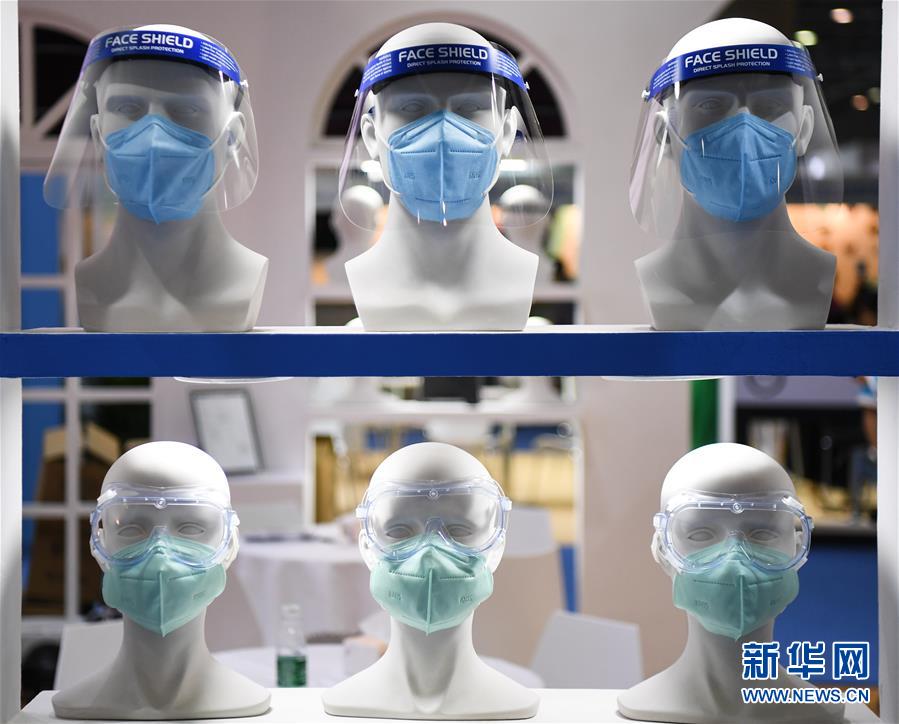 6月10日拍摄的展会上的口罩和防护罩产品。当日,广州国际防疫物资展览会在保利世贸博览馆举行。本次展会面积共计3.6万平方米,设有防疫产品、设备、综合服务、原辅料等4个展区,参展企业约600家。新华社记者邓华摄