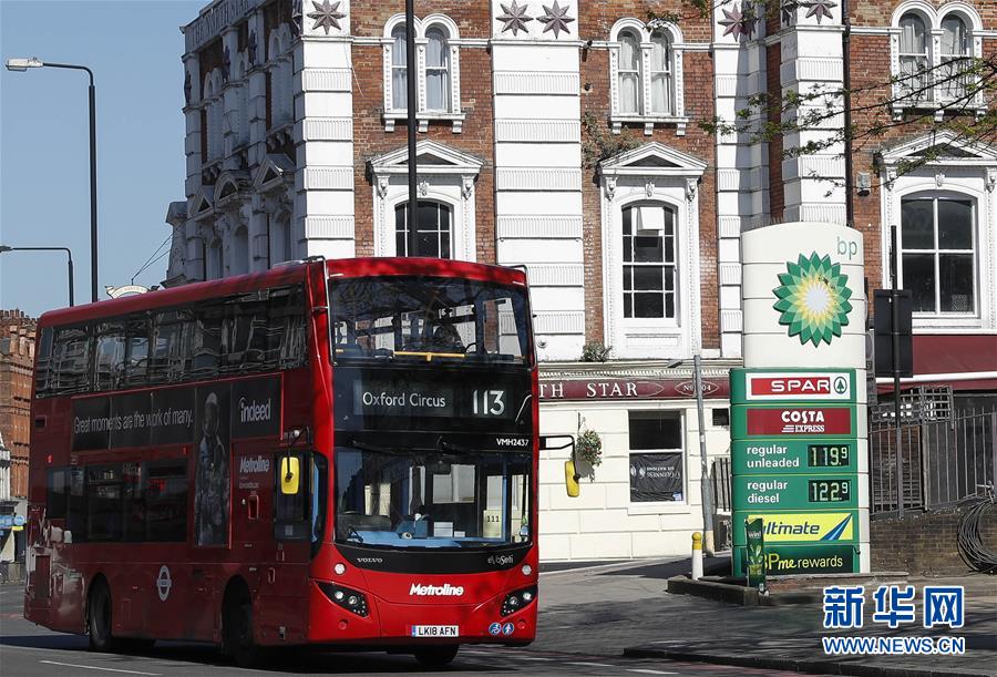 这是2020年4月21日在英国伦敦拍摄的红色双层巴士驶过英国石油公司加油站的资料照片。新华社记者韩岩摄