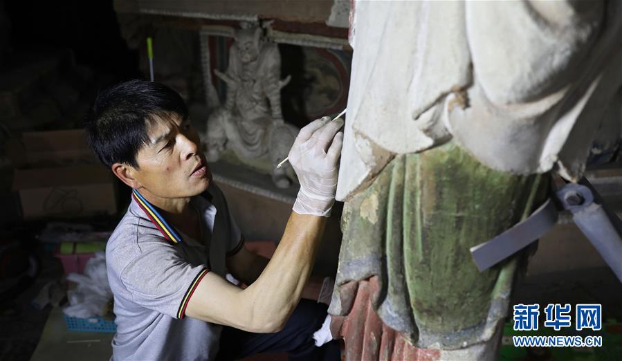 6月8日,工作人员对奉国寺的彩绘泥塑进行保护修复。新华社记者 姚剑锋 摄