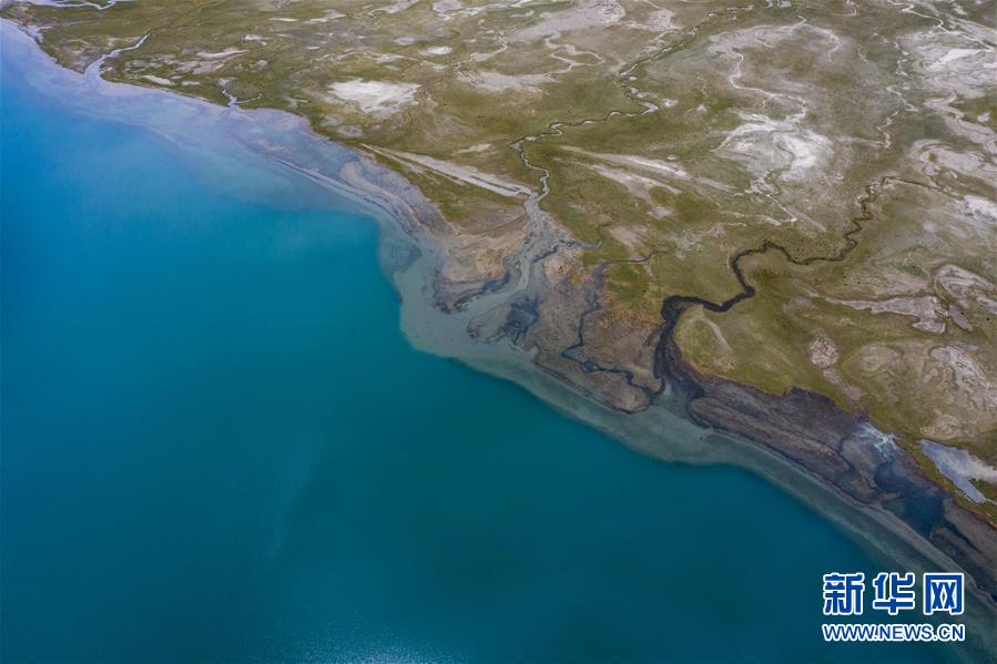 帕米尔高原上的喀拉库勒湖及湖畔湿地一景(6月16日摄,无人机照片)。新华社记者 胡虎虎 摄