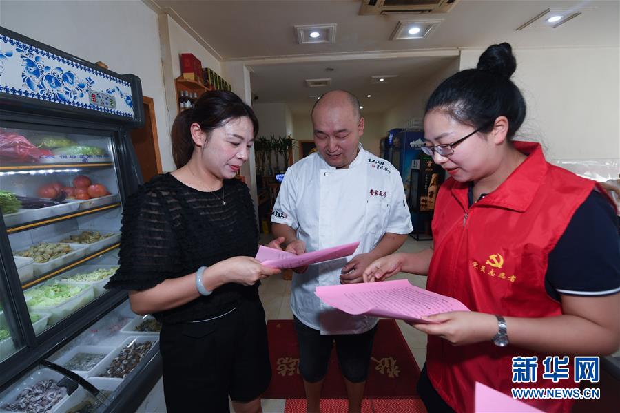 6月17日,党员志愿者(右)在东林镇一家农家乐内给经营户发放野生动物保护及禁食倡议书。新华社记者 徐昱 摄