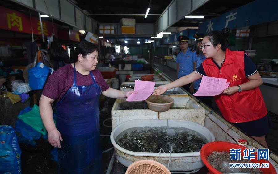 6月17日,党员志愿者(右一)在东林镇农贸市场给经营户发放野生动物保护及禁食倡议书。新华社记者 徐昱 摄