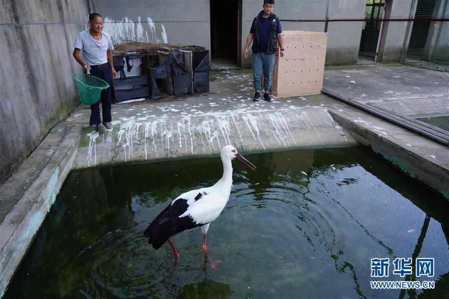 6月17日,工作人员准备将三只东方白鹳装箱。新华社记者 周密 摄