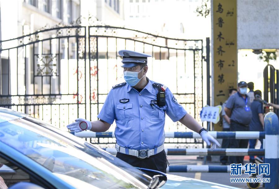 6月20日,在乌鲁木齐市第二中学门前,乌鲁木齐市公安局交警支队天山区大队新华路中队警官罗晓亮在指挥交通。当日,乌鲁木齐市初中升高中考试开始。为保障为期三天的中考顺利进行,乌鲁木齐市公安局交警支队在各考点执勤,为考生保驾护航新华社记者 王菲 摄